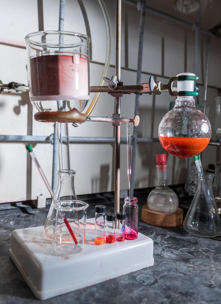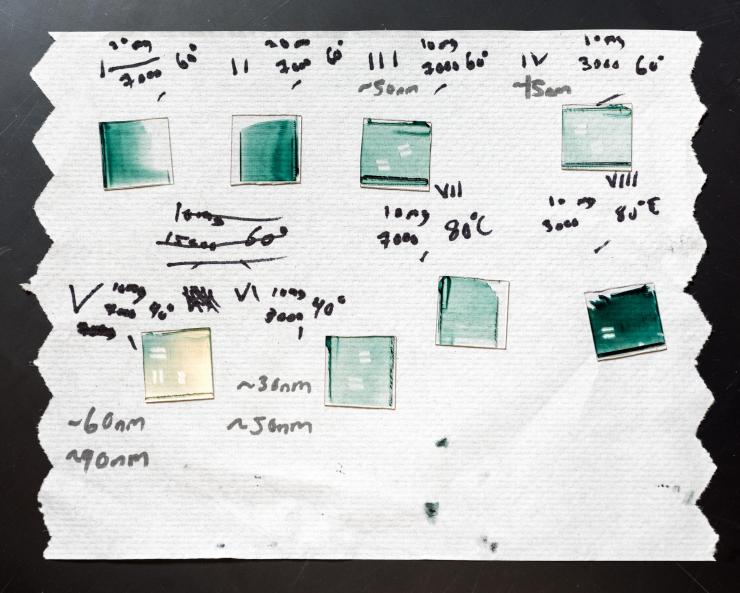 To make sure that the film doesn’t smear or run after printing and that it functions well when it’s completed, Schmatz cleaves off that added chemical trigger from the conjugated polymer by shining ultraviolet light on the electrochromic film.